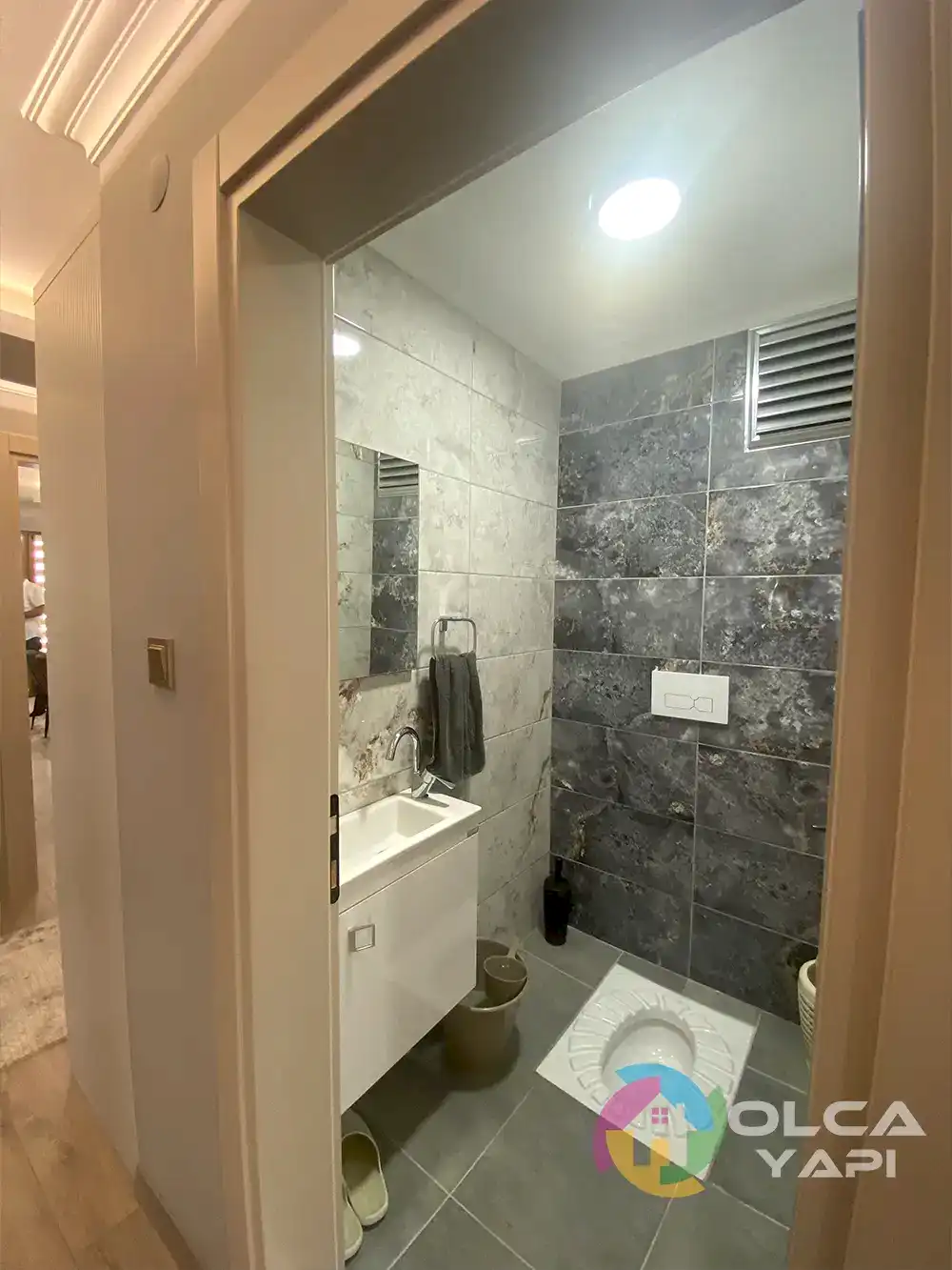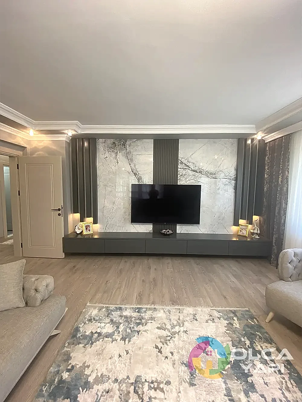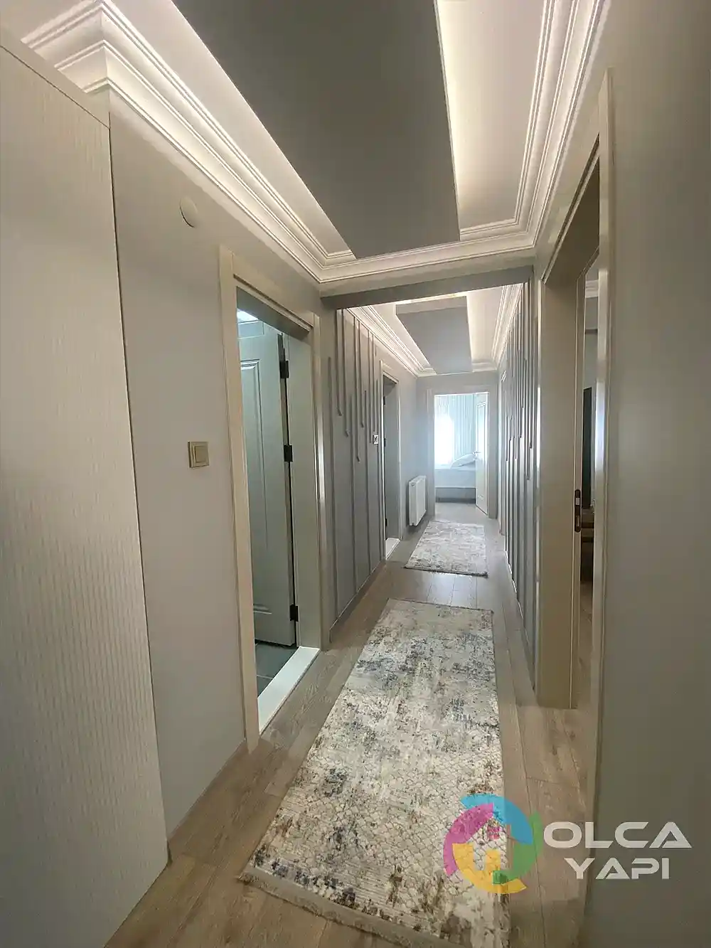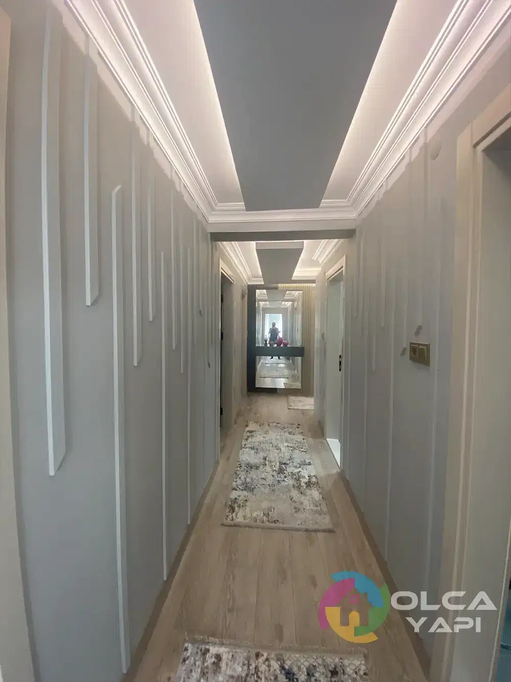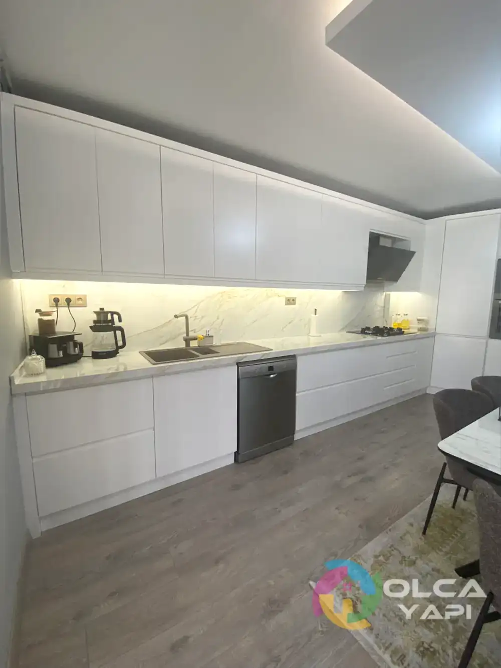 Kerim Bey’in dairesinde kapsamlı bir tadilat gerçekleştirdik. Mevcut mutfak dolapları sökülerek, yeni tesisat işlemleri yapıldı. Tüm dairenin prizleri yenilendi. Balkona şeffaf camlı balkon uygulandı ve çelik kapı monte edildi. İç kapılar gri lake olarak yenilendi. Mutfak ve salon tavanına saten alçı uygulanarak ışık bandı ve gün ışığı LED eklendi. Tüm dairenin duvarları ve tavanları boyandı. Balkon zeminine seramik döşendi, diğer zeminlere parke kaplandı. Mutfakta yeni dolaplar, Calacatta Borghini porselen tezgah ve Franke evye ile armatür kullanıldı. TV arkası, antre ve salonda çıtalama yapıldı. Antreye özel üretim dresuar ve portmanto monte edildi. Salonda TV ünitesi ve yemek masası arkasına dekoratif uygulamalar yapıldı. Banyoda, WC’de ve ebeveyn banyosunda tesisatlar yenilendi, seramik döşendi, banyo dolapları ve aksesuarlar monte edildi. Ayrıca balkon dolapları tamir edildi ve vestiyer arka balkona taşındı. Salon için klima elektrik tesisatı çekildi.