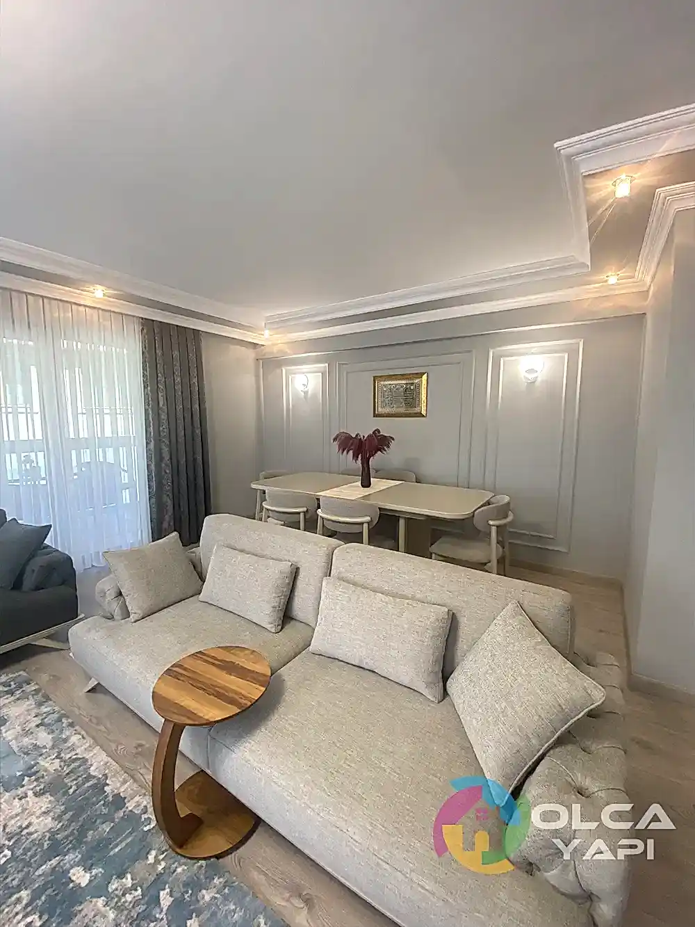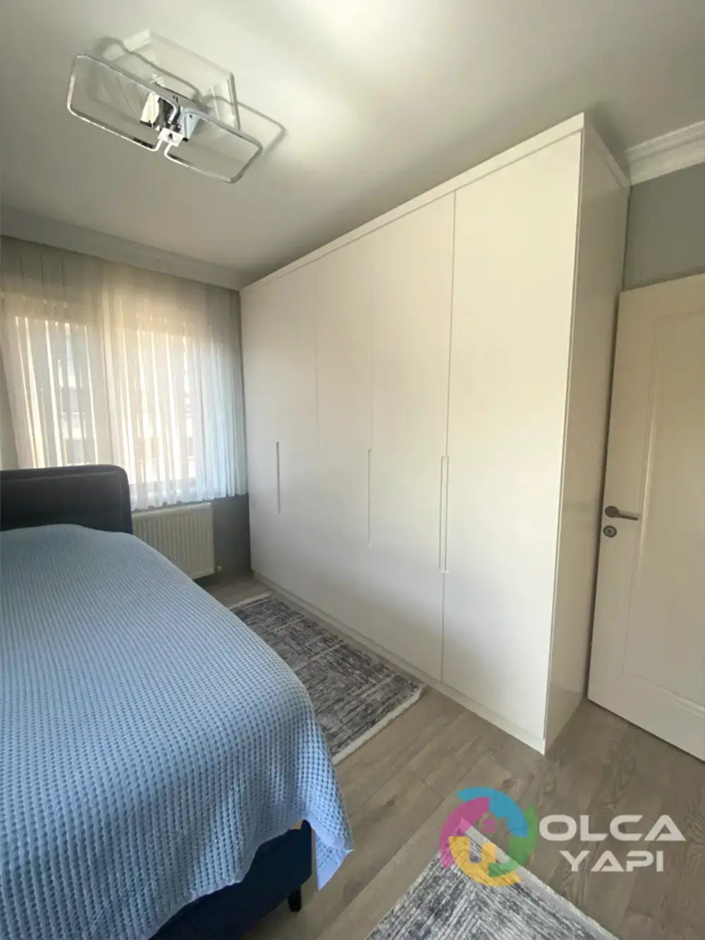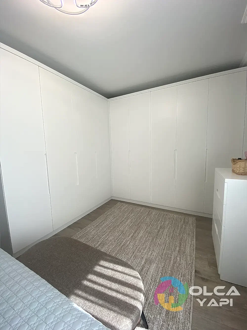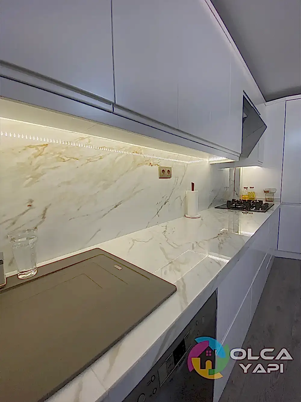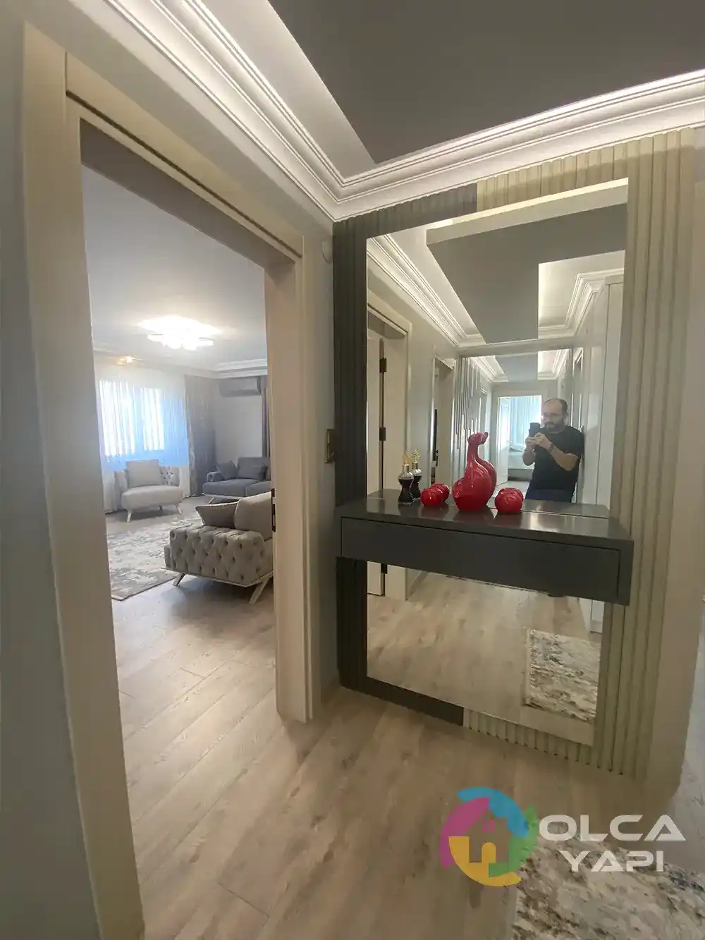 Kerim Bey’in dairesinde kapsamlı bir tadilat gerçekleştirdik. Mevcut mutfak dolapları sökülerek, yeni tesisat işlemleri yapıldı. Tüm dairenin prizleri yenilendi. Balkona şeffaf camlı balkon uygulandı ve çelik kapı monte edildi. İç kapılar gri lake olarak yenilendi. Mutfak ve salon tavanına saten alçı uygulanarak ışık bandı ve gün ışığı LED eklendi. Tüm dairenin duvarları ve tavanları boyandı. Balkon zeminine seramik döşendi, diğer zeminlere parke kaplandı. Mutfakta yeni dolaplar, Calacatta Borghini porselen tezgah ve Franke evye ile armatür kullanıldı. TV arkası, antre ve salonda çıtalama yapıldı. Antreye özel üretim dresuar ve portmanto monte edildi. Salonda TV ünitesi ve yemek masası arkasına dekoratif uygulamalar yapıldı. Banyoda, WC’de ve ebeveyn banyosunda tesisatlar yenilendi, seramik döşendi, banyo dolapları ve aksesuarlar monte edildi. Ayrıca balkon dolapları tamir edildi ve vestiyer arka balkona taşındı. Salon için klima elektrik tesisatı çekildi.