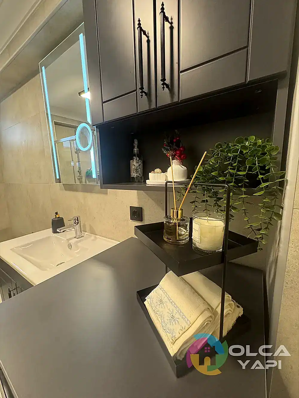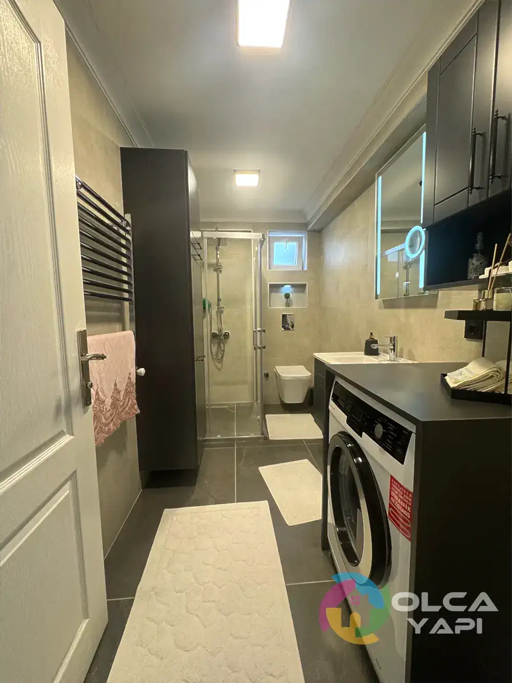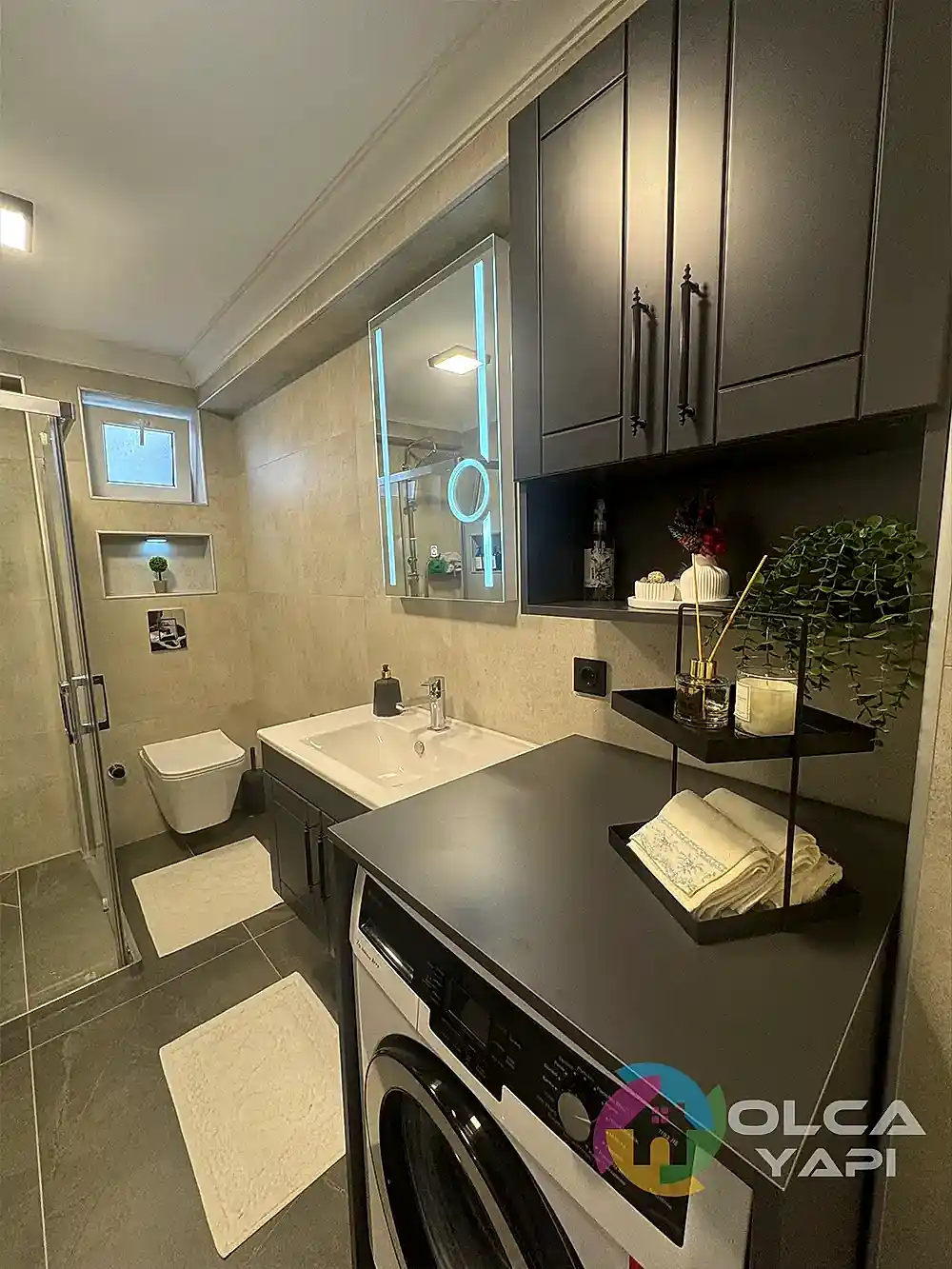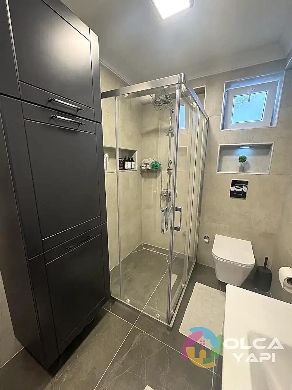 Demirci Mahallesi’nde Abdullah Bey’in dairesinde banyo tadilatı gerçekleştirdik. Banyo duvarlarına 60×120 Kütahya Seramik Vista Bone, zeminlerine 60×120 Kütahya Seramik Adria Mocha granit döşedik. 80 cm seramik lavabo ve özel üretim antrasit lake kapaklı banyo dolabı monte ettik, dikdörtgen LED’li ayna ve 55×190 çift kirli sepetli boy dolabı ekledik. Artema Root Raund krom lavabo ve banyo bataryaları, tepe duş seti, standart tekneli krom profil şeffaf cam duşakabin (H:180) uygulandı. Çamaşır makinesi dolabı gövde MDF lam ve antrasit lake kapaklarla yapıldı. Banyo priz sorti kaydırma işlemleri tamamlandı.