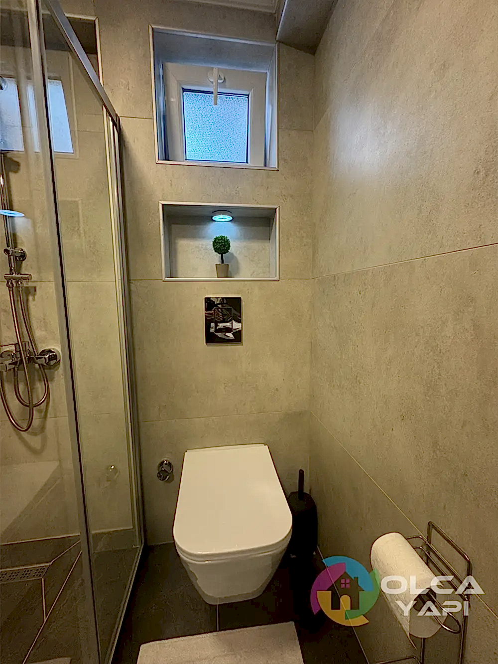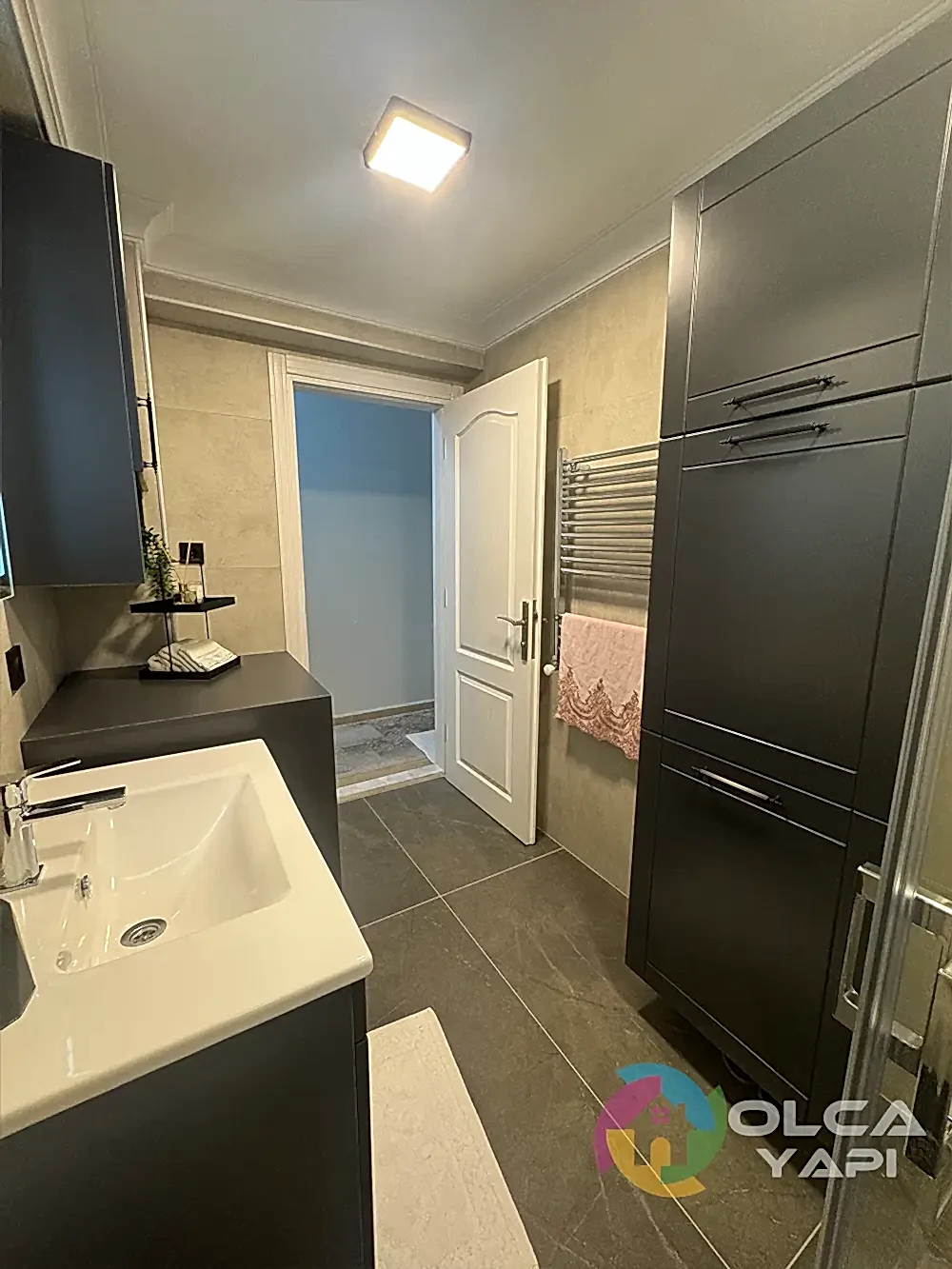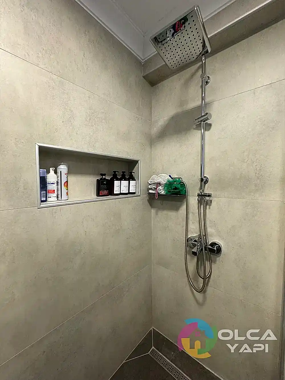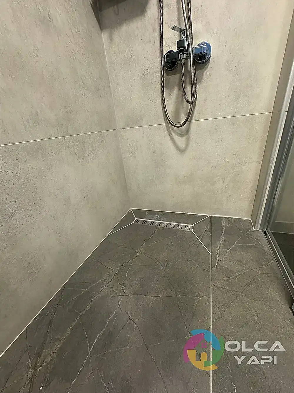 Demirci Mahallesi’nde Abdullah Bey’in dairesinde banyo tadilatı gerçekleştirdik. Banyo duvarlarına 60×120 Kütahya Seramik Vista Bone, zeminlerine 60×120 Kütahya Seramik Adria Mocha granit döşedik. 80 cm seramik lavabo ve özel üretim antrasit lake kapaklı banyo dolabı monte ettik, dikdörtgen LED’li ayna ve 55×190 çift kirli sepetli boy dolabı ekledik. Artema Root Raund krom lavabo ve banyo bataryaları, tepe duş seti, standart tekneli krom profil şeffaf cam duşakabin (H:180) uygulandı. Çamaşır makinesi dolabı gövde MDF lam ve antrasit lake kapaklarla yapıldı. Banyo priz sorti kaydırma işlemleri tamamlandı.